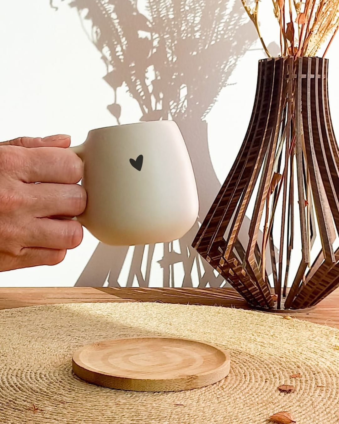 Lindo conjunto com 2 canequinhas em cerâmica 150ml cada, com pires em bambu.