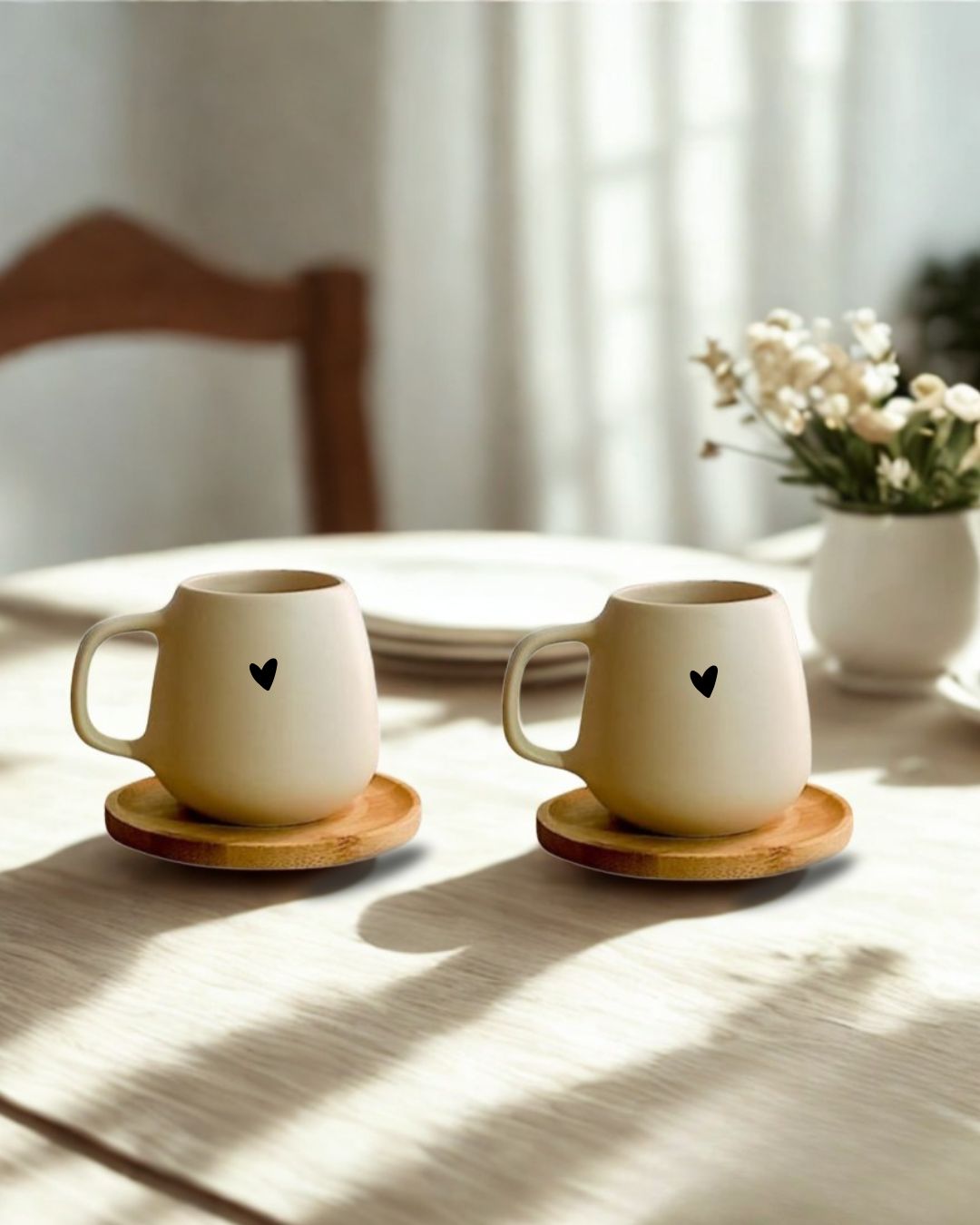 Lindo conjunto com 2 canequinhas em cerâmica 150ml cada, com pires em bambu.