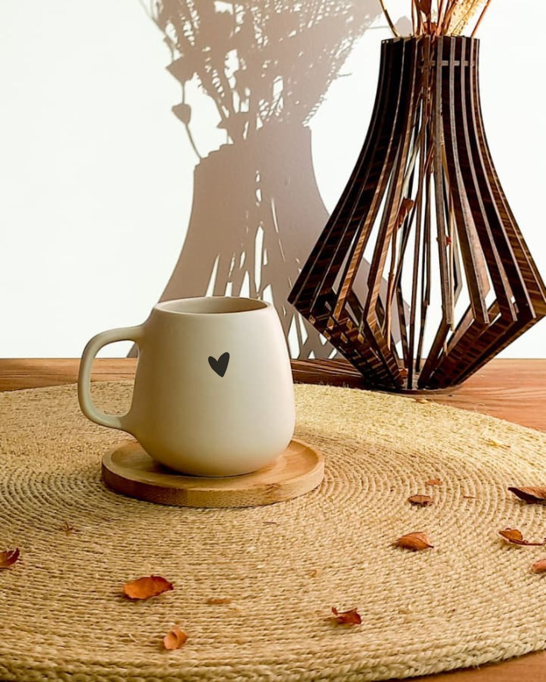 Canequinha em cerâmica 150 ml, com pires em bambu.