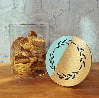 Porta Mantimentos de vidro borossilicato com tampa de bambu com pintura artesanal. Tampa com anel de silicone e vedação hermética, mantendo o alimento preservado por mais tempo.