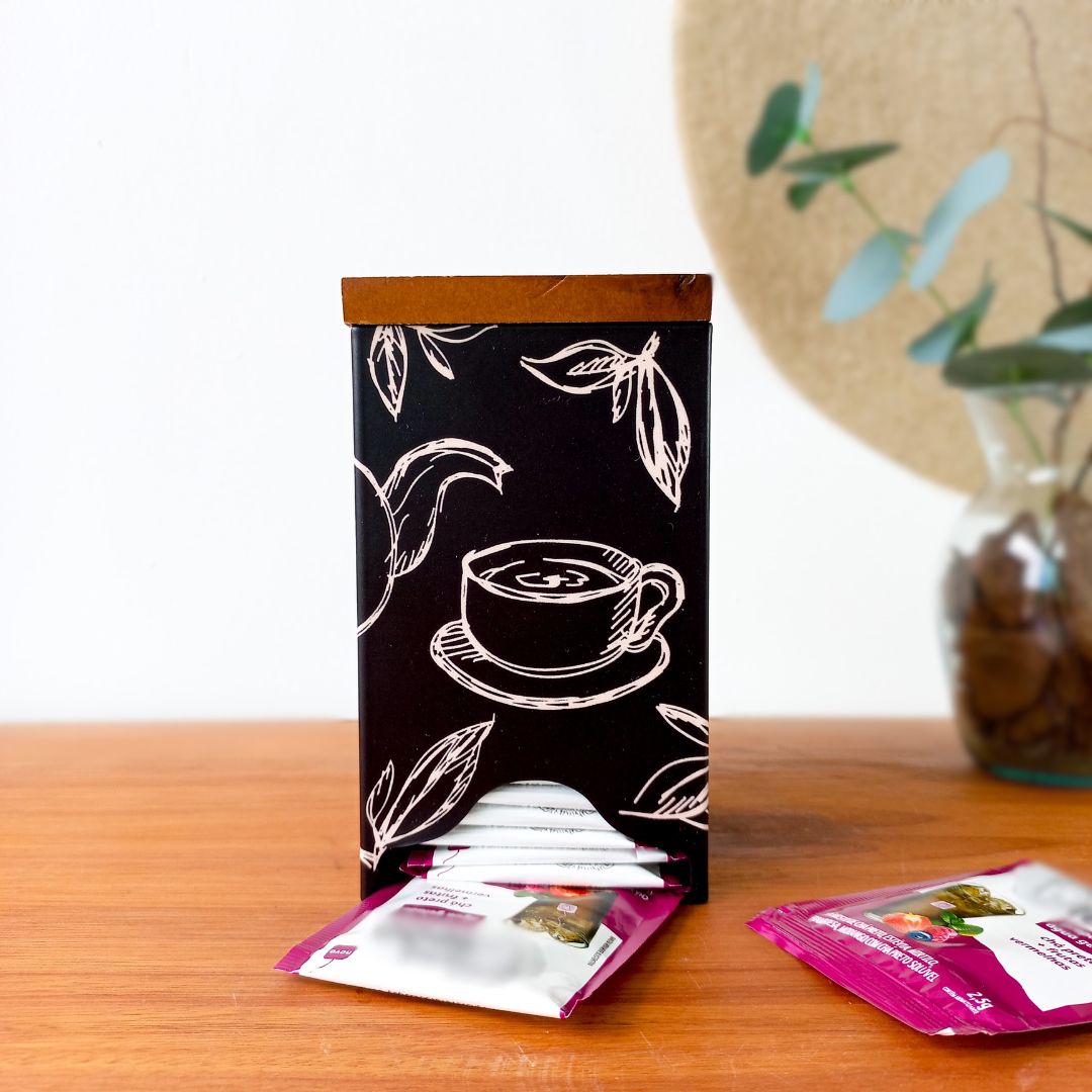 Para organizar os sachês de chá e decorar. Produto de aço e madeira certificada de reflorestamento fabricado no Brasil. É resistente e durável.